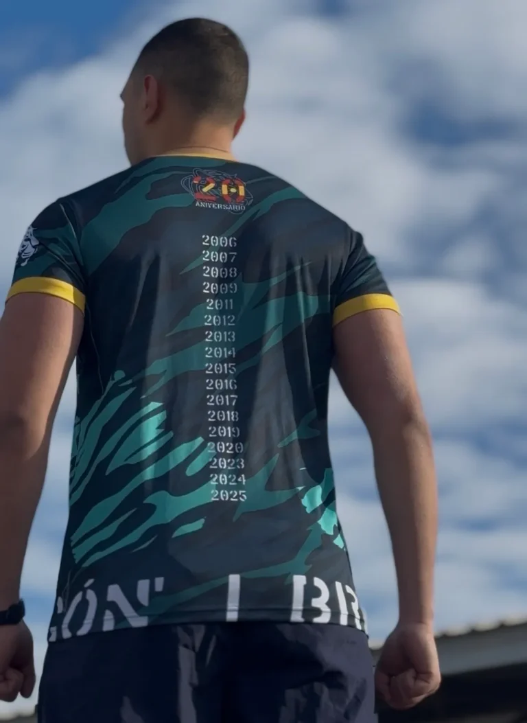El Diseño: Hemos apostado por una trama de camuflaje moderna en tonalidades verdes militares, la esencia de nuestro terreno. Pero fíjate bien: entre el patrón se intuye en color turquesa vibrante la silueta inconfundible del arco de artillería.